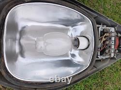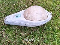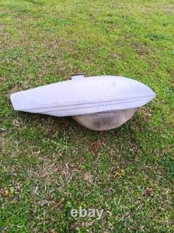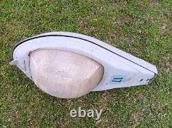 Vintage General Electric mid 1960's M-250 thumb latch 175 W Mercury Vapor Cobrahead. Been stored in HVAC environment and not left outside. No cracks or chips in refractor or dents in the reflector. Bottom door fits as shown with a smooth latch operation and the door hinges are all complete without damage and operate as intended.